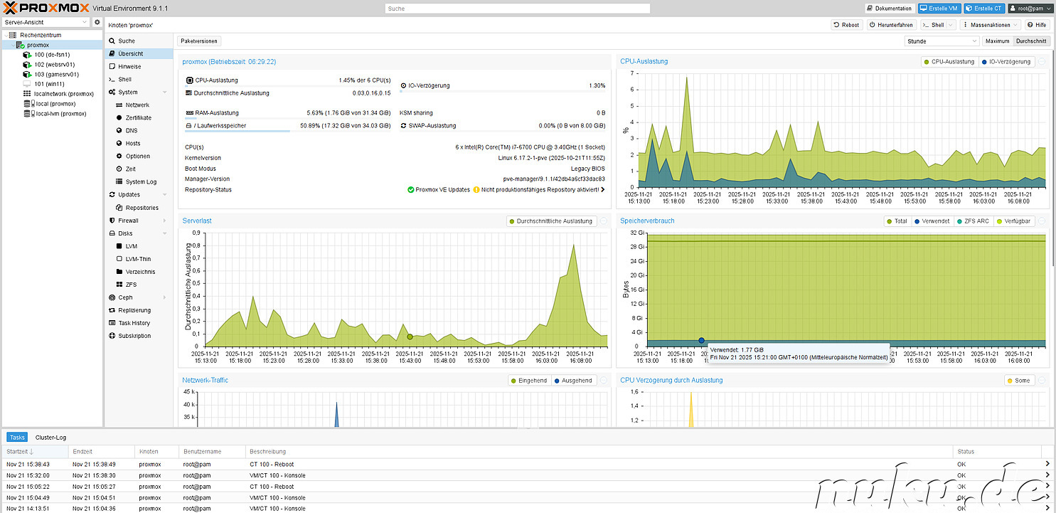 Ein wenig komplizierter wurde die Angelegenheit, weil ich keinen freien dedizierten Server zur Verfügung hatte. Daher habe ich Proxmox selbst mit QEMU/KVM virtualisiert. Kleinere Probleme verursachte dabei der von QEMU bereitgestellte DHCP-Server in den LXC-Containern. Dort nutze ich jetzt statische Adressen. Aber echt verrückt, wie gut das funktioniert - trotz doppelter, verschachtelter Virtualisierung.